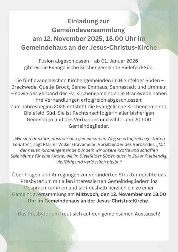 Die fünf evangelischen Kirchengemeinden im Bielefelder Süden – Brackwede, Quelle-Brock, Senne-Emmaus, Sennestadt und Ummeln – sowie der Verband der Ev. Kirchengemeinden in Brackwede haben ihre Verhandlungen erfolgreich abgeschlossen: Zum Jahresbeginn 2026 entsteht die Evangelische Kirchengemeinde Bielefeld-Süd. Sie ist Rechtsnachfolgerin aller bisherigen Gemeinden und des Verbandes und zählt rund 20.500 Gemeindeglieder.